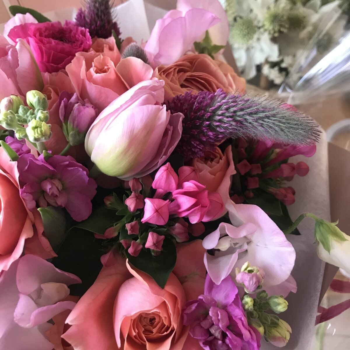 おすすめの季節のお花を入れておまとめします。 華やかで可愛らしいピンク色のブーケは やはり女性への贈り物にぴったりです。 その他の御祝やお供え等、 色々なご用途におすすめします。 …